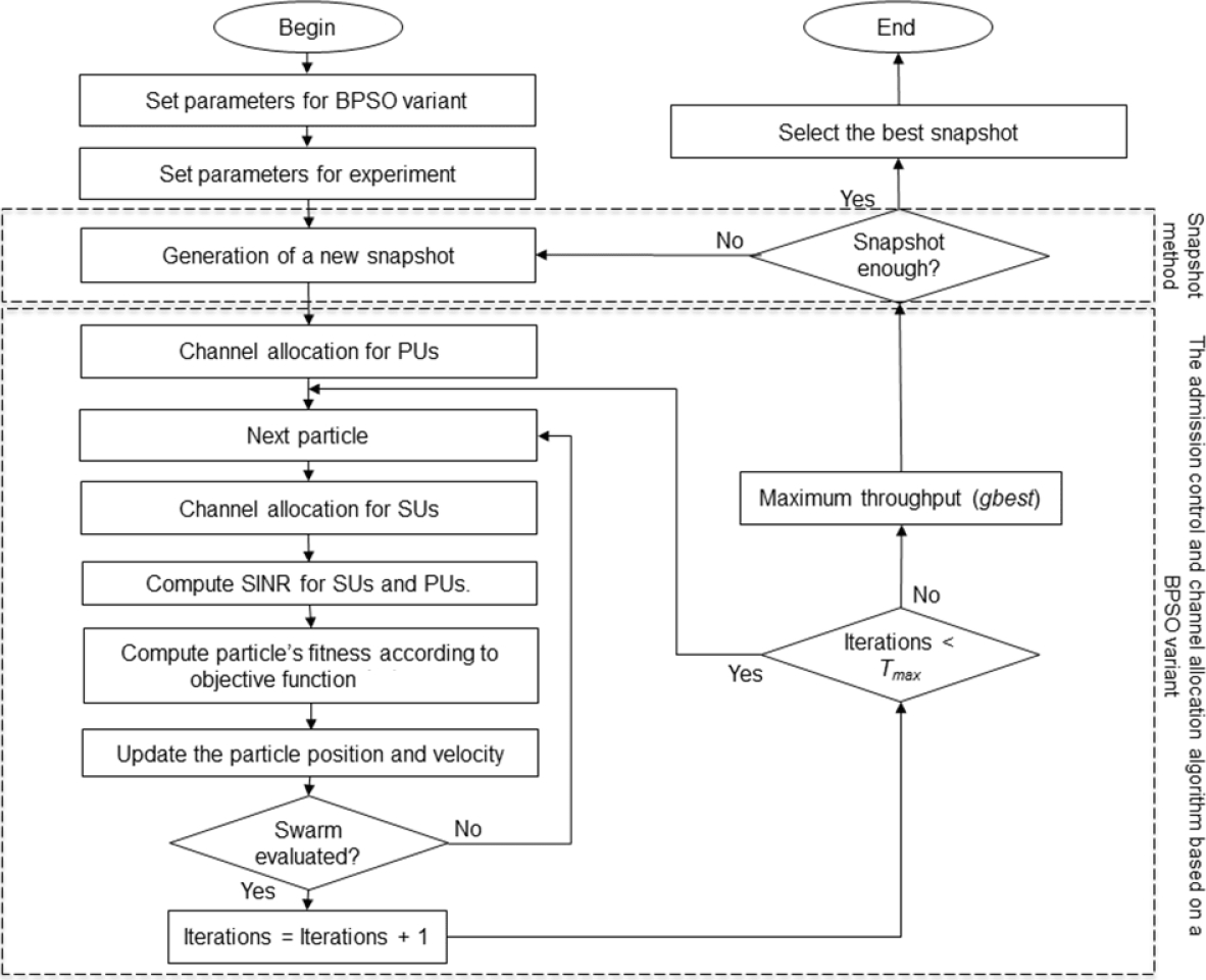 The simulation methodology is in Fig. 4. Once we set the parameters for a BPSO variant and experiment, the admission control and channel allocation algorithm based on a BPSO variant generates a snapshot of a HetNet scenario, and then the BPSO variant is run to solve equations (5) - (11). After the admission control and channel allocation algorithm based on a BPSO variant finishes its execution, it computes the maximum throughput for that snapshot. If the admission control and channel allocation algorithm based on a BPSO variant achieves the total sample snapshots to analyze, it selects the sample snapshot with the highest throughput.