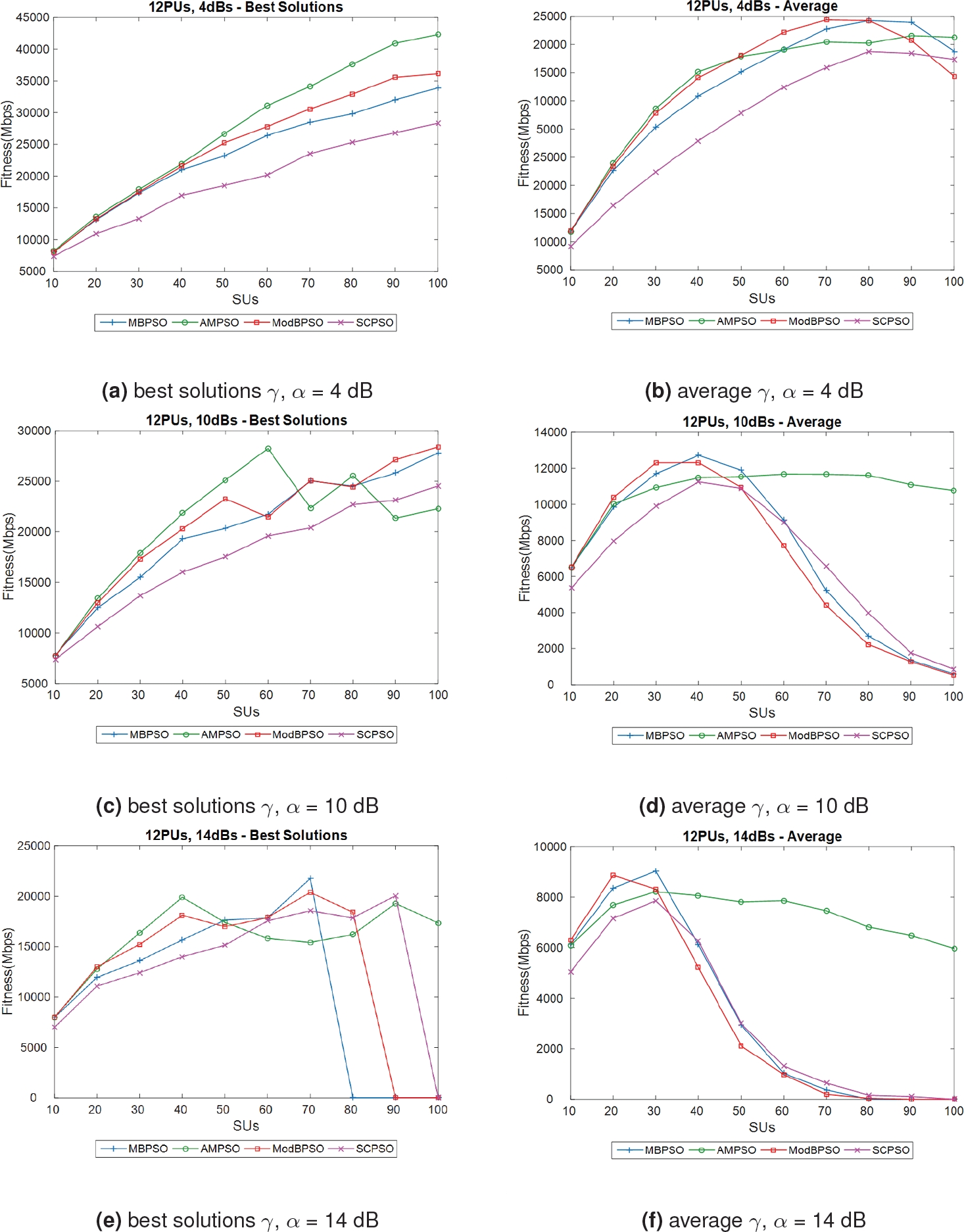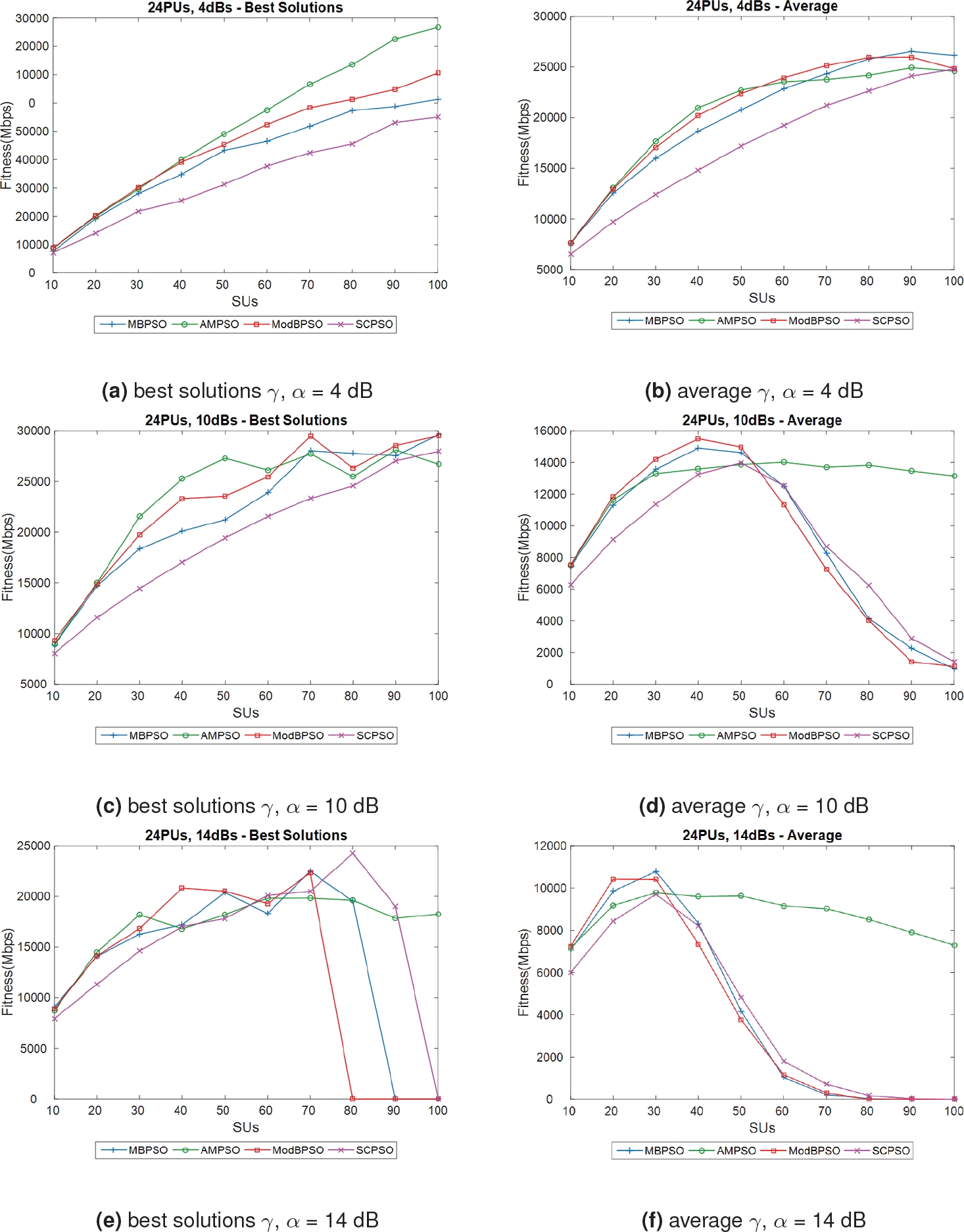 While the curves of ModBPSO, MBPSO and SCPSO come down in the range 30 - 40 SUs deployed in the area, AMPSO keeps almost a constant throughput with the highest data rates. When the other BPSO variants fail to find a solution, as in Fig. 5f which is the most challenging scenario, AMPSO is able not only in finding a solution but also in offering the one with the highest data rate.
