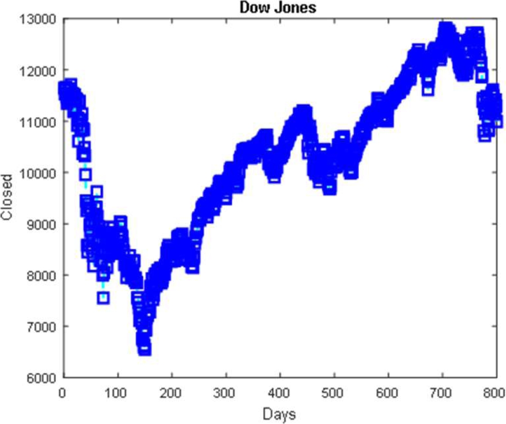 Fig. 3 presents the graph of the Dow Jones data [16], where we are using 800 data that correspond to period from 07/01/2017 to 09/05/2019. We used 70% of the data for the RNN trainings and 30% to test the RNN.