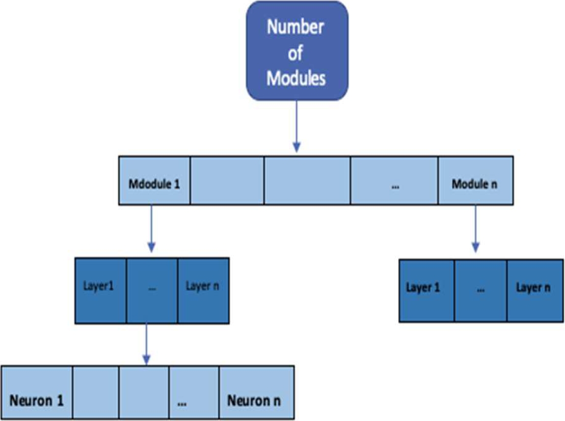 | Evolutions | Gen. | Ind. | Pm | Pc | Num. Modules | Num. Layers | Num. Neurons | Duration | Prediction Error |