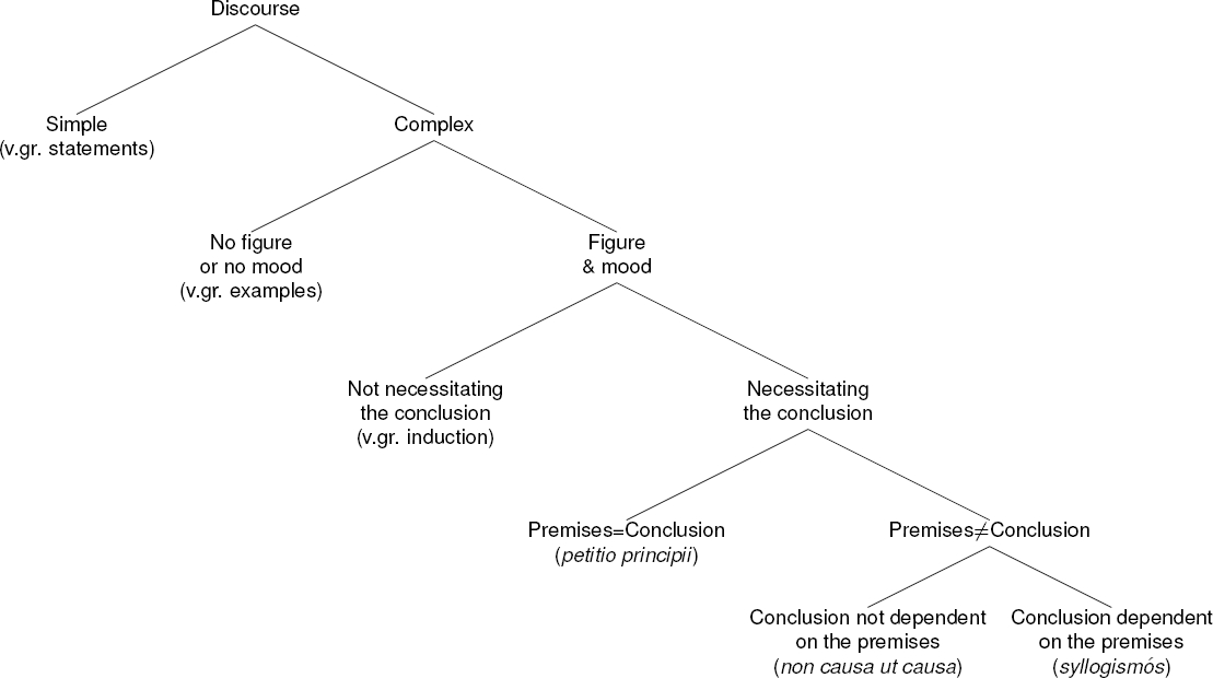 This Boethian exposition clarifies that, within the Aristotelian way of thinking or paradigm, a syllogistic inference or syllogism—syllogismós—is a piece of complex discourse (insofar as it includes at least two premises and one conclusion) with mood and figure (because the order of statements and terms matters) in which a conclusion that is different from the premises (thus avoiding petitio principii) necessarily (and hence deductively) follows from and dependes on said premises (thus avoiding irrelevance, non causa ut causa).