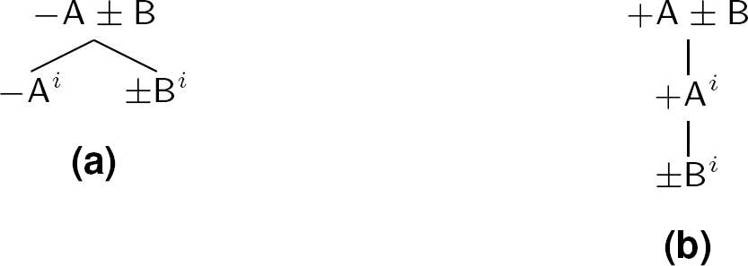 Now, as exposed in [7, 4] and following [8, 22], we can develop a tableaux proof method for TFL. Hence, we say a tableau for TFL is an acyclic connected graph determined by nodes and vertices. The node at the top is called root. The nodes at the bottom are called tips. Any path from the root down a series of vertices is a branch. To test an inference for validity we construct a tableau which begins with a single branch at whose nodes occur the premises and the rejection of the conclusion: this is the initial list. We then apply the rules that allow us to extend the initial list (Figure 2).
