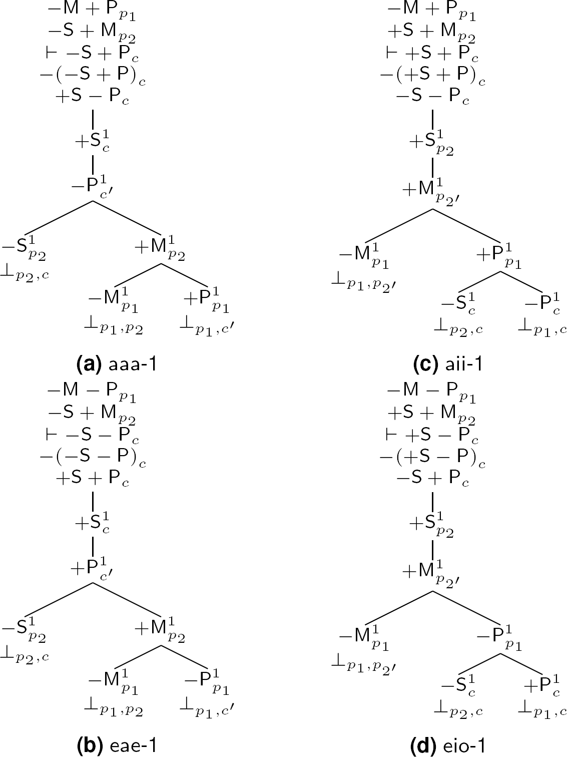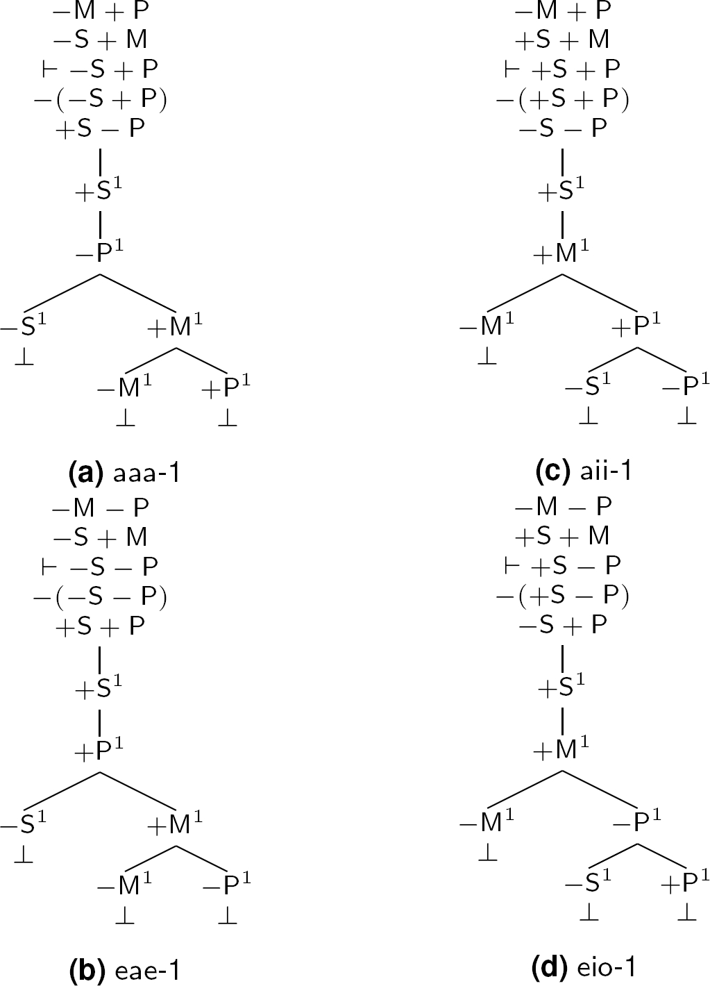 To describe the process we follow to unfold each tableaux consider Figure 3a (cf. [4]). The first three lines are the premises and the conclusion, and the fourth line is the rejection of the conclusion: all these lines but the conclusion define the initial list. Then the fifth line is the result of applying a rule of rejection to the conclusion. Then the next couple of lines is the result of applying the rule for an i proposition to the fifth line, picking index 1. Then the first split results from applying the rule for an a proposition to the second line (i.e. the minor premise), also picking index 1, since we want the indexes to unify. This split produces two branches, one of which (the leftmost) includes terms +S1 and −S1 on two of its nodes, and hence is closed; the remaining branch is not closed yet, so we continue with the same process: we split the last available premise (i.e. the major premise) to obtain, again, a couple of branches, one of which (the leftmost) includes terms −M1 and +M1 on two of its nodes, and hence is closed; and the other (the rightmost) that contains terms +P1 and −P1 on two of its nodes, and hence is closed as well.