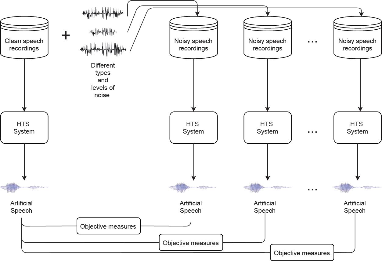 The evaluation metrics proposed in the following section were used to compare the level of degradation on the artificial voice in comparison with the base system (HTS clean). A diagram of the complete process is presented in Figure 2.