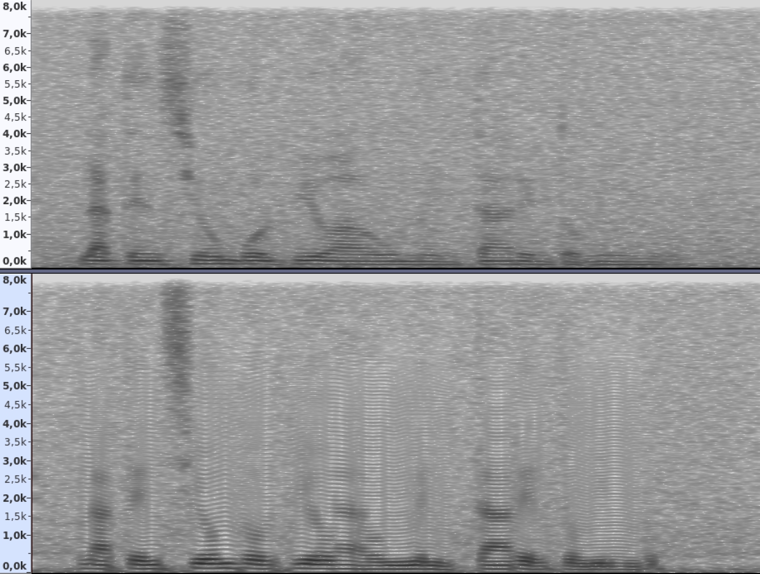 Fig. 3 Spectrograms of an utterance with White noise at SNR5 (above) and the same utterance synthesized from a database degraded with the same type and level of noise (below)