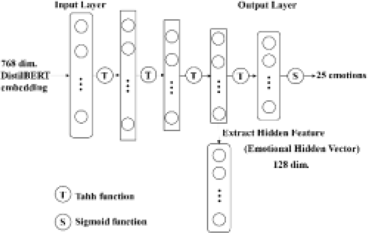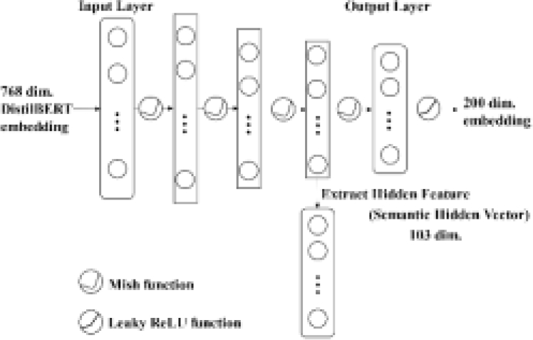 We used DistilBERT embeddings as inputs. Because the distributed representation vector to be predicted also contains negative values, we use Mish [18] as the activation function that can retain negative values. Figure 1 illustrates the structure of the semantic vector extraction network model. Using this model of semantic vectors together with the model of emotional vectors that will be described later, it is possible to consider both semantics and emotion. The hidden feature vector is called a semantic hidden vector (S-HV). The S-HV is a vector with 103 dimensions.