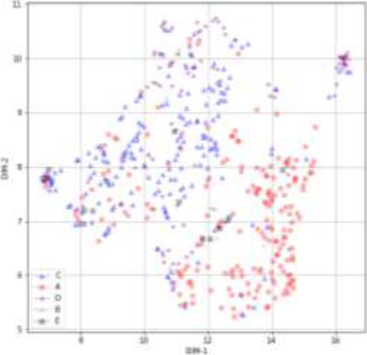 The results of emotional embedding, compressed using autoencoder based on neural networks, are converted to two dimensions by UMAP[19] and visualized in Fig. 3. From this figure, we can see that E (neutral) and B (surprise) are distributed in several clusters, and A (joy), C (Anger), and D (Sorrow) partially form their own clusters.