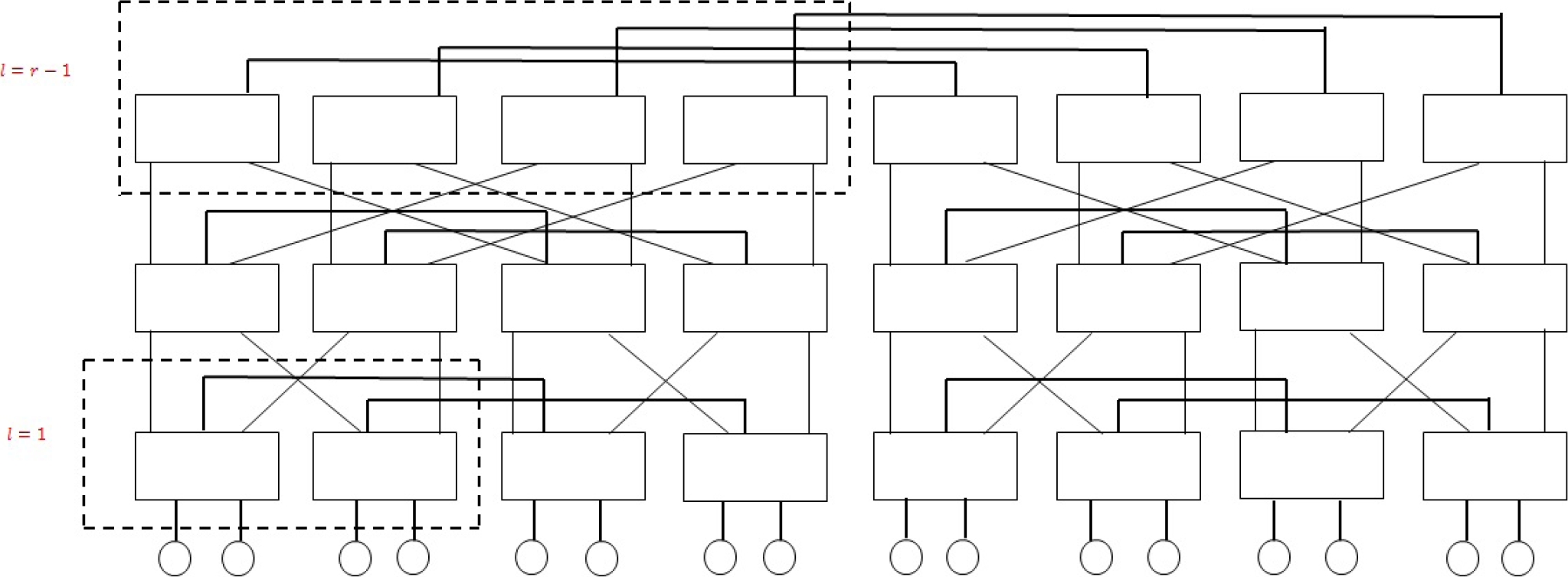 Fig. 7 Figure depicts how the blocks of 2l routers are counted. At the level 1 and 2 at l=1 and at higher levels l=r1