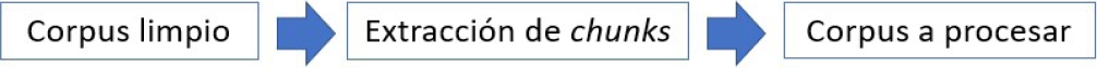 Un proceso adicional al paso de limpieza del corpus que se propone en el presente trabajo es utilizar la potencialidad de las librerías como Spacy [7] y limpiar un poco más el corpus a procesar detectando los enunciados característicos o chunks de cada una de las descripciones limpias, para ello se propone un proceso como el que se muestran en la figura 2, el cual toma como entrada cada una de las descripciones en el corpus limpio, extrae de éste los chunks y utiliza éstos chunks como la descripción original, generando con ello un nuevo corpus basado en chunks.