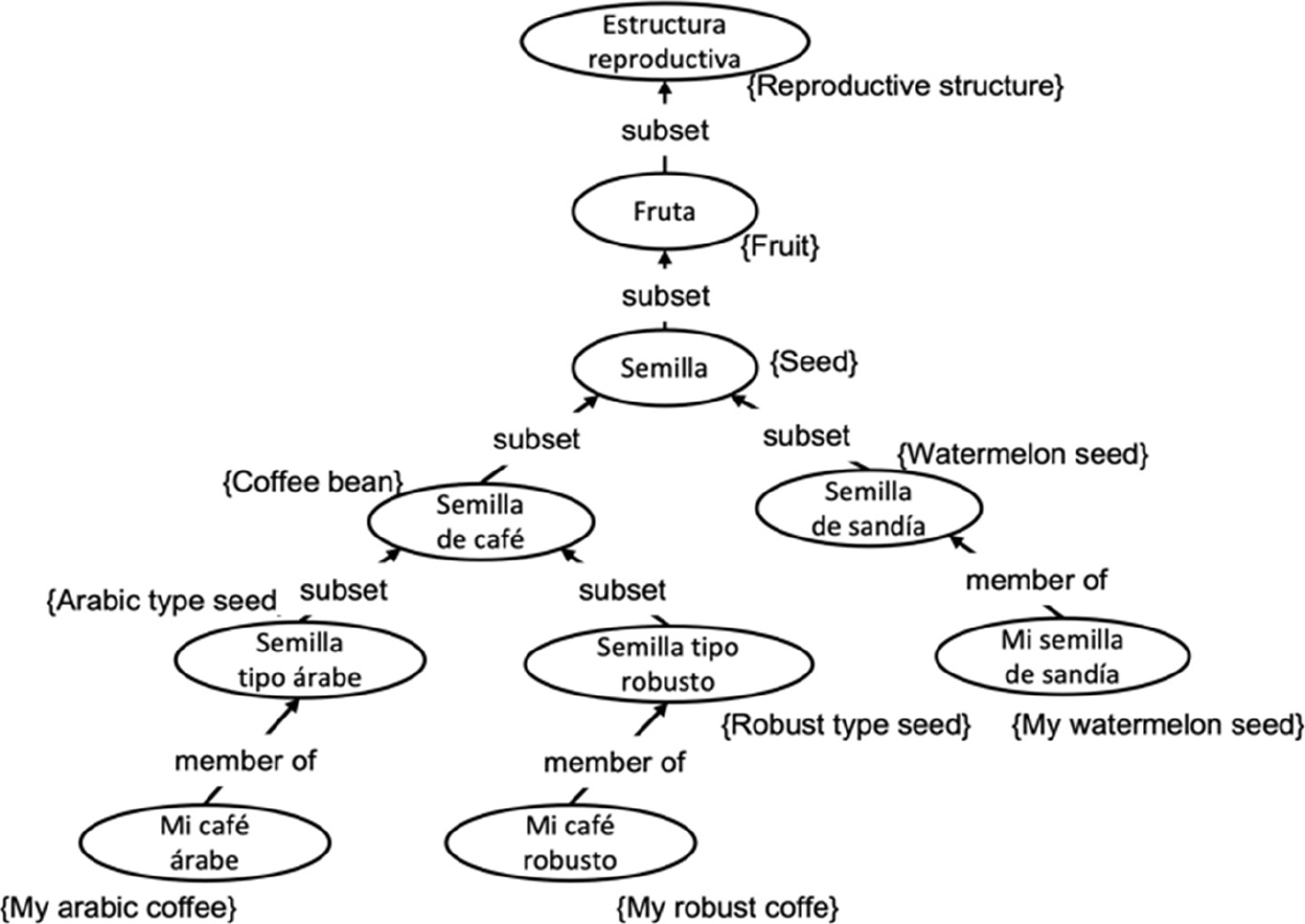 Fig. 2 In the ontology some instances are Mi Café Arabe {My Arabic coffee}, Mi café Robusto {My Robust coffee} and Mi semilla de Sandía {My Watermelon seed} and some types are Semilla Tipo Árabe {Arabic type seed}, Semilla tipo Robusto {Robust type seed]. The link member of Mi café Robusto {My Robust coffee} member of Semilla tipo Robusto {Robust type seed} means that the first is an instance, object or example of the second