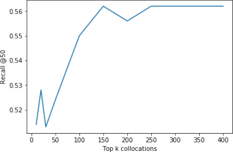Finally, we check how our system’s performance is affected by adding word associations as an additional source for generating interpretation candidates. When we run our system using only dependency-based collocations as candidates, we obtain Recall@50 score of 0.551. This was improved to 0.562 when we add word associations as candidates.