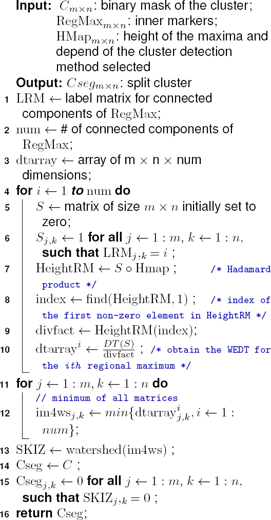 The algorithm used to segment the clusters operates by means of a combination of the conventional distance transform, the H-maxima transform, morphological operations and a weighted external distance transform combined with marker-controlled watershed segmentation, as will be described in detail later. This allowed using the information obtained during the clusters detection to facilitate their subsequent segmentation (split).