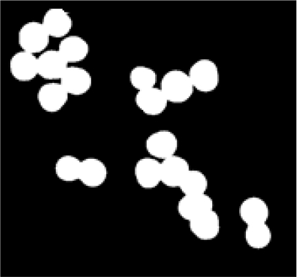 The whole detection and segmentation process begins with a coarse segmentation, which produces a binary image in which the touching or overlapping erythrocytes remain as connected components. The binary images used in our experiments contain clusters of various sizes and were obtained through coarse segmentation of microscopy images, which correspond to mice peripheral blood smears stained with Giemsa.