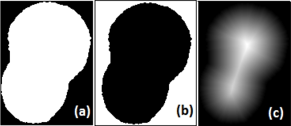 Fig. 3 (a) Binary image from overlapping cells. (b) Complemented binary image. (c) Distance transform