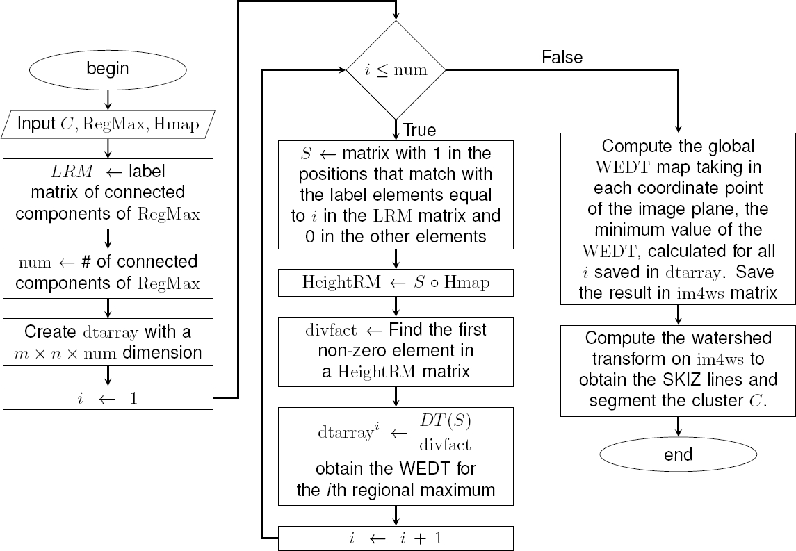 4. Build the skeleton by influence zones (SKIZ) [9] which correspond to the regional maxima for each cluster, using the weighted EDT (WEDT ), which is the EDT with its values divided (weighted) by a factor obtained during the selection of the valid regional maxima described in the next section.