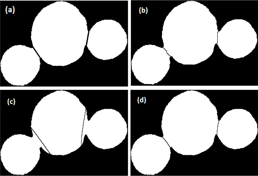 A method based on concave points extraction through polygonal approximation and ellipse fitting bubbles with average distance deviation criterion and two constraint conditions was addressed in [45]. Reference [44] employed a modified version of curvature scale space method to extract corner points and then recognize the concave points by evaluating angular changes.