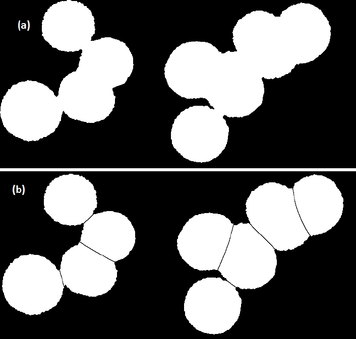 In reference [42] the gradient-barrier watershed algorithm is proposed, in which the gradient in the overlapping region is used directly as the barrier to the water flow. A cluster segmentation method based in the use of structural features and morphological image processing is showed in [20], again obtaining high accuracy in terms of performance measures (sensitivity, specificity) of the cluster detection process as well as accuracy of segmentation.