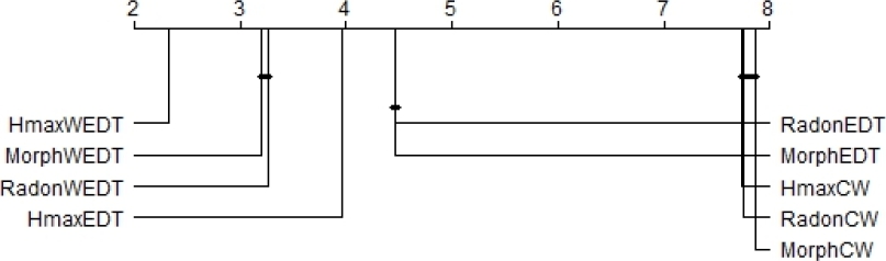 There are no significant differences between the algorithms HmaxCW, MorphCW and RadonCW for which their mean ranks are very similar.