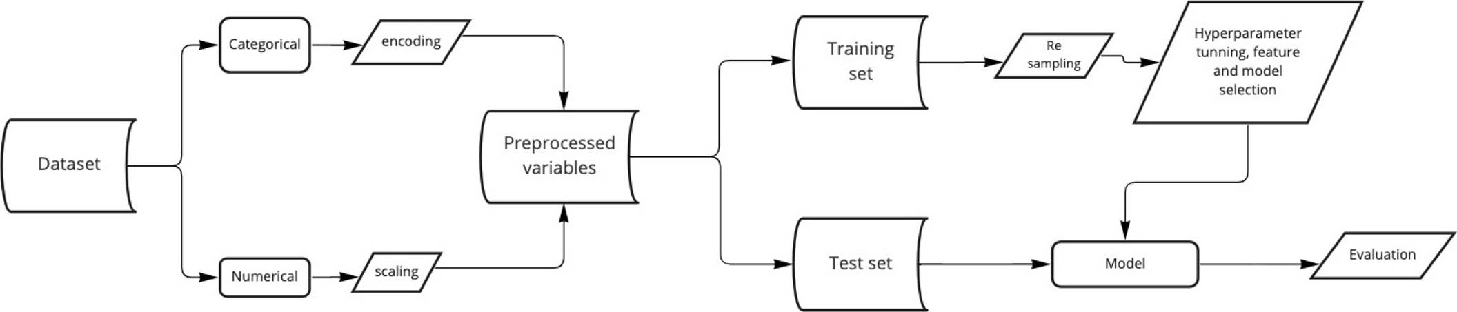 For feature preparation, we decided to use the sklearn pre-processing module on Python, OneHotEncoder and StandardScaler, to perform the first part of the process. Then, for re-sampling, we have used RandomOverSampler and RandomUnderSampler for balancing the classes. And, finally, we split the data in training and holdout sets.
