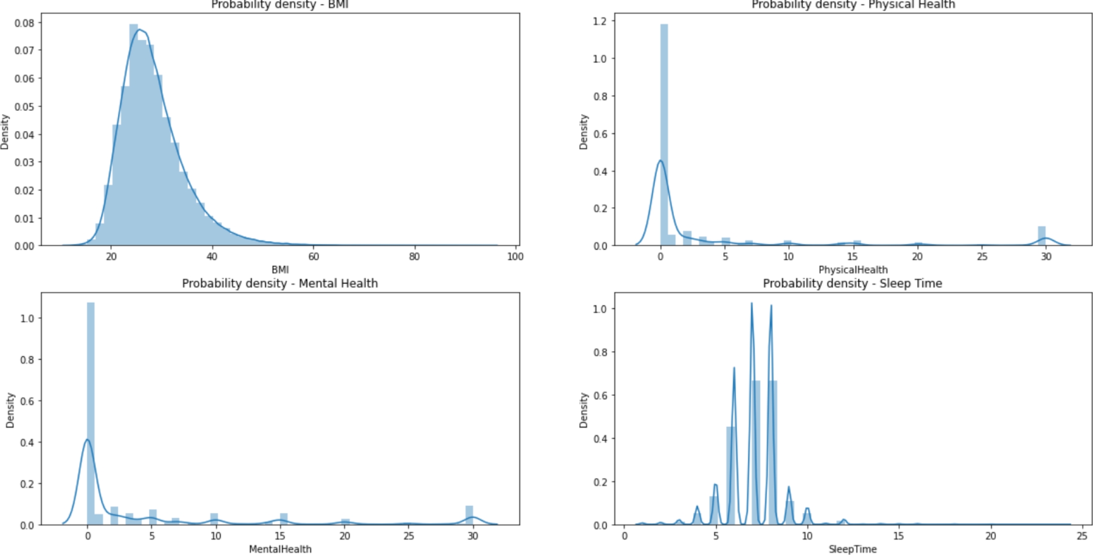 The dataset is divided into 13 categorical variables, 4 numerical variables and one categorical target (‘HeartDisease’), consisting of 319,795 records without null values; but it is heavily unbalanced. Table 1 represents the frequency of the most common category on each categorical feature, while Fig. 2 represents the distribution of the four numerical variables.