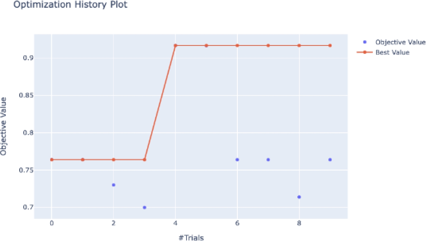 The following graphs shows the objective value for each trial ran by the optuna objective function, in this case, it only shows the top 10 trials. We can see that it starts with an objective value around 0.76 and after the fourth trial, it shows the best objective value with a value around 0.915.