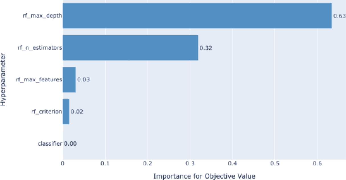 Figure 4 shows an example of the evolution of the model accuracy (objective function) based on the trials of the different combinations of the hyper-parameters. Another representation of the hyper-parameter evolution under the optimization process can be seen in Fig. 5. In addition, Fig. 6 shows an example of the influence of the hyper-parameters in the model accuracy (objective function). The latter would be interesting for better understanding on the role of the hyper-parameters in the building of the models.