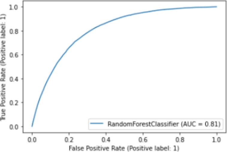 Figure 7 shows the ROC curve of the Random Forest model. We find that our model has an AUC (Area Unders Curve) of 0.81, which is equivalent to the probability that a randomly chosen positive instance is ranked higher than a randomly chosen negative instance. Note that the ROC does not depend on the class distribution. This makes it useful for evaluating classifiers predicting rare events such as ours.