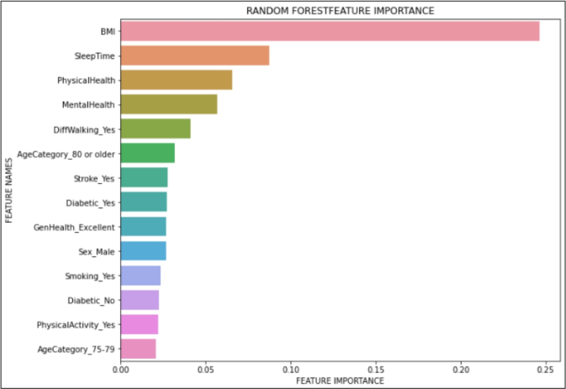 We also did a feature importance graph to find which variables are the most important ones for the model. Out of 41 different features, Fig. 8 only shows the fourteen most important features, such as body mass index (BMI), sleep time, physical health, mental health, among others.