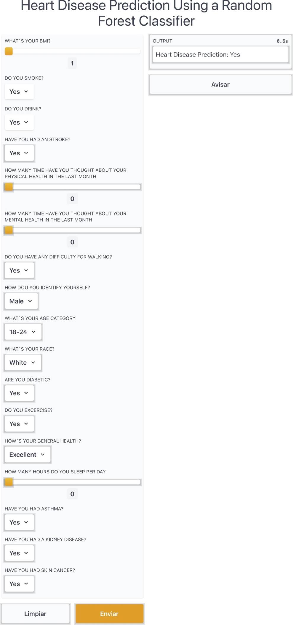 Furthermore, we created an application on Gradio library of Python in order to create a functional application to show our model. In the application, the user inputs the required parameters using a friendly interface, and those inputs are processed in order to obtain a quick result of the heart disease prediction of the person. Figure 9 shows an excerpt of the web application running the Random Forest classifier.
