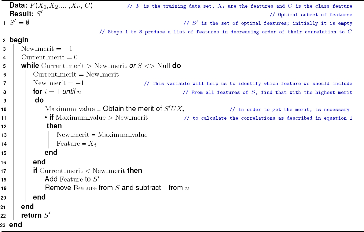 The CFS algorithm searches the next feature to be added to the set
