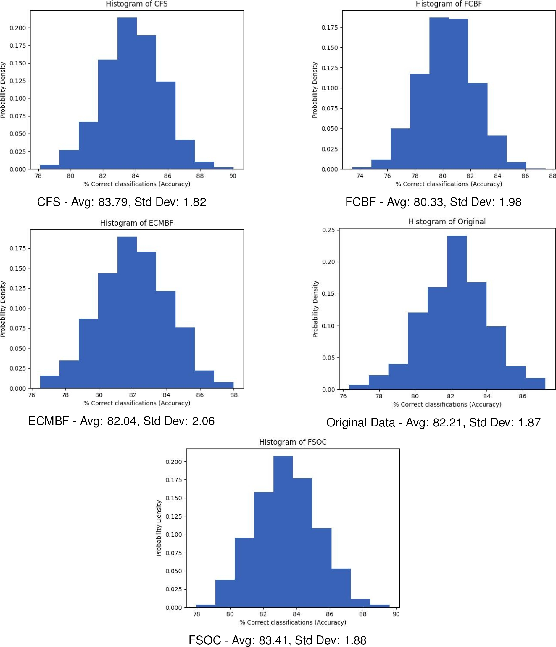 Table 7 Naive Bayes classification for each data set and feature selection algorithm. On average FSOC is slightly below CFS but with less features and computational costs. Also, FSOC is better than full data set, ECMBF and FCBF algorithm. In the Poker data set, an anomaly is shown, where all the feature selectors and the original set do not present any difference, unlike other classifiers (tables 5 and 6). This is probably due to its high unbalance in the classes and that it is not the best classifier for this set