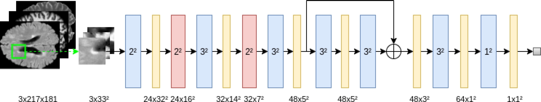 The output layer corresponds to a 1-dimensional sigmoidal activation function that retrieves the probability of a voxel belonging to the MS-related lesion class.