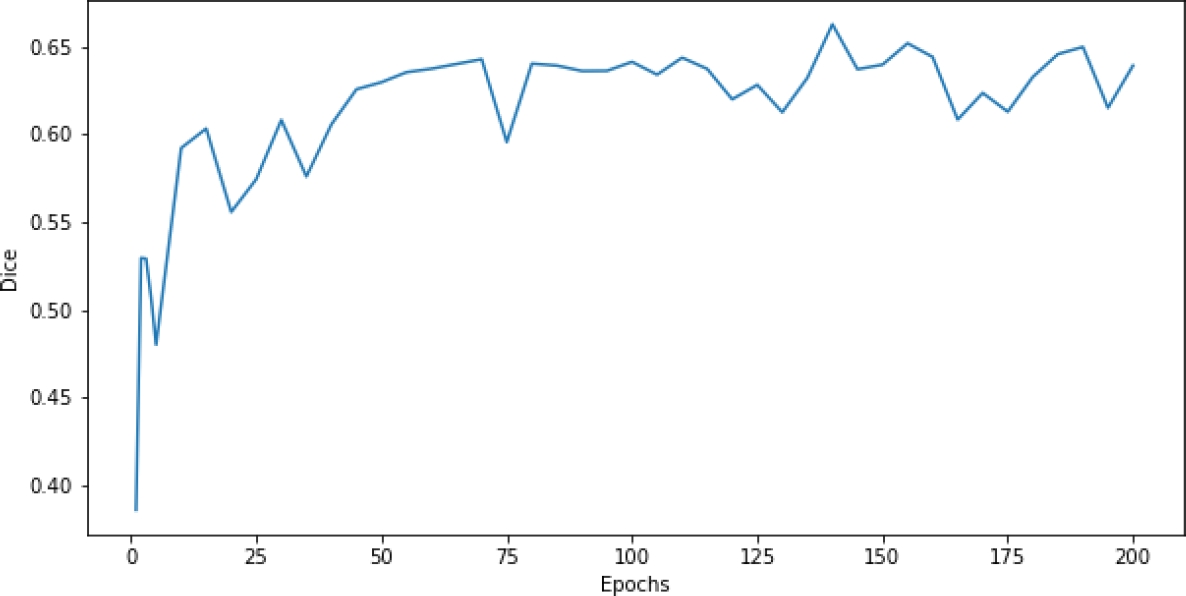 The details are presented in Table 1. The number of epochs was determined in such a way that the Dice similarity coefficient reaches a stable value in the validation set (a total of 100 epochs was applied for training, see Figure 2).