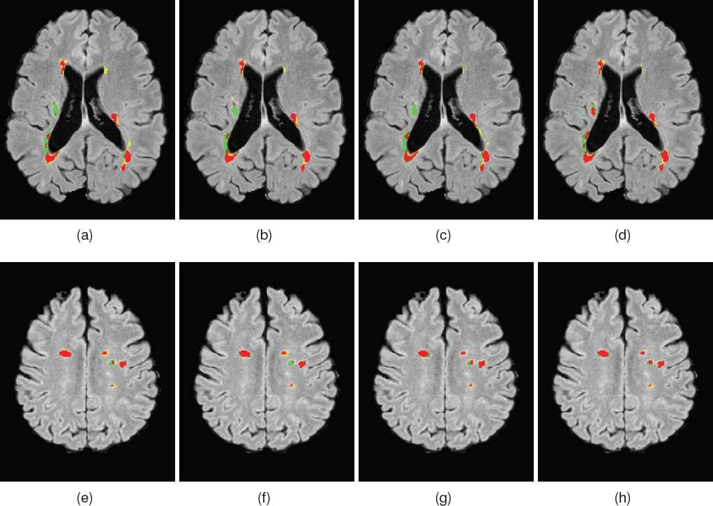 Some segmentation results are shown in Figure 3. Axial FLAIR MRI views of a patient with multiple sclerosis are presented with the segmentation mask obtained with our proposed algorithm overlayed. True positive are represented in red, false negative errors are presented in green and false positive errors in yellow.
