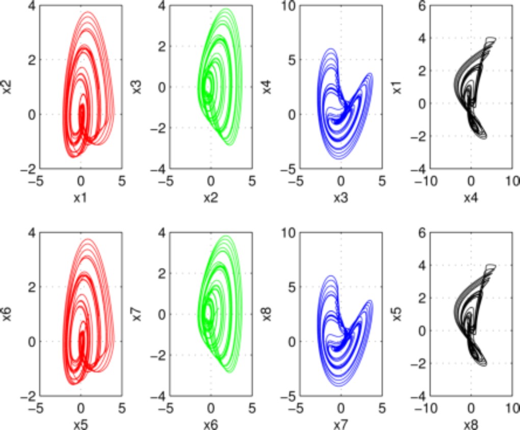 Fig. 4 Phase planes. In top row the phase-portraits corresponding to drive system (20)-(23); in bottom row the phase-portraits corresponding to response system (24)-(27), respectively