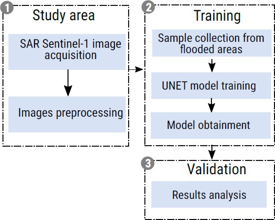 Consequently, it requires image processing for noise correction. Likewise, the use of deep learning, for flood detection, can be considered efficient in terms of time, cost and performance. When satellite SAR data is available during and after floods this methodology can be very useful to provide rapid flood mapping results in emergency situations.