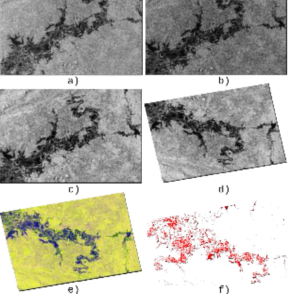 – Geometric calibration. SAR images may be distorted or rotated, requiring rearrangement. To make the geometric correction, the Digital Elevation Model (DEM) of the SRTM (Shuttle Radar Topography Mission)fn was used. Figure 4d shows the rearrangement of the SAR image of the study área.