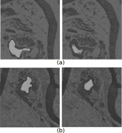 Fig. 6 Result of the trained neural model. (a,b-left) shows the truth of the ground. (right) Corresponds to the prediction of the model with 25 (a) and 50 (b) epochs, respectively
