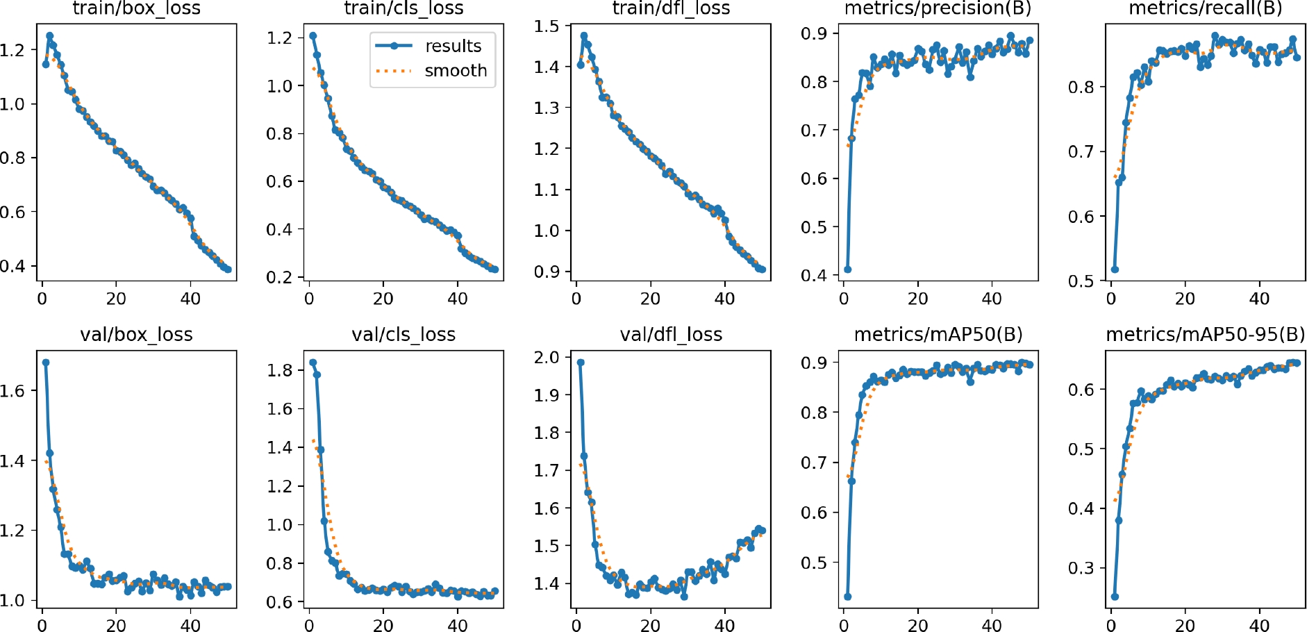 where true positives are the correctly predicted positive instances and false negatives are the instances that are actually positive but were predicted as negative. Recall helps assess how well the model captures all instances of the objects in the dataset. The mAP at IoU 0.5 is calculated by averaging the precision values at a specific IoU threshold (commonly set to 0.5) for each class.