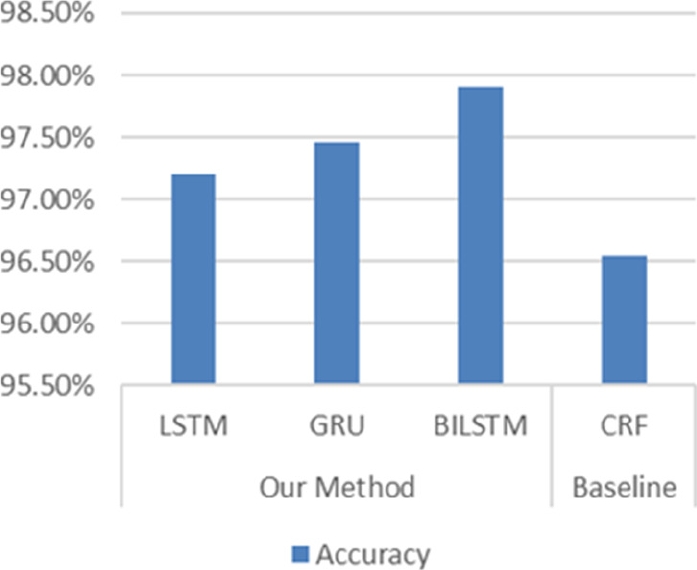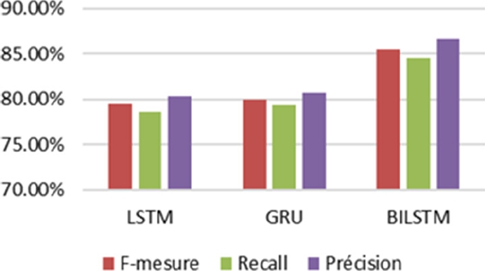 As shown in Figure 5, the LSTM, GRU, and BILSTM models outperformed the CRF model, which achieved an accuracy of 81.57%, a recall of 73.86%, and an F-measure of 76.23%. Indeed, among the DL-based models, BILSTM achieved the best results and significantly improved our baseline with a 5.14% increase in precision, a 10.68% increase in recall, and a 9.36% increase in F-measure.