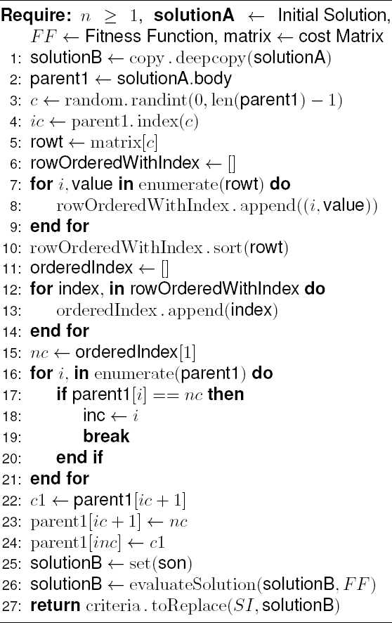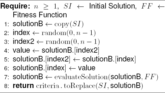 A simple definition given by [51] is ”Heuristic approach is based on trial and error to find or discover solutions to the problems”. Two types of heuristics are most commonly used in metaheuristics: construction and perturbation. According to those mentioned earlier, we define construction and perturbative heuristics used in this work. According to [29], two main techniques for building Traveling Salesman Problem (TSP) solutions are greedy heuristic or aleatory and the formal definition of TSP can be found in [25]. In this investigation, the aleatory heuristic was chosen to make the initial solutions (see Algorithm 1) and five perturbative heuristics described in algorithms 2, 3.