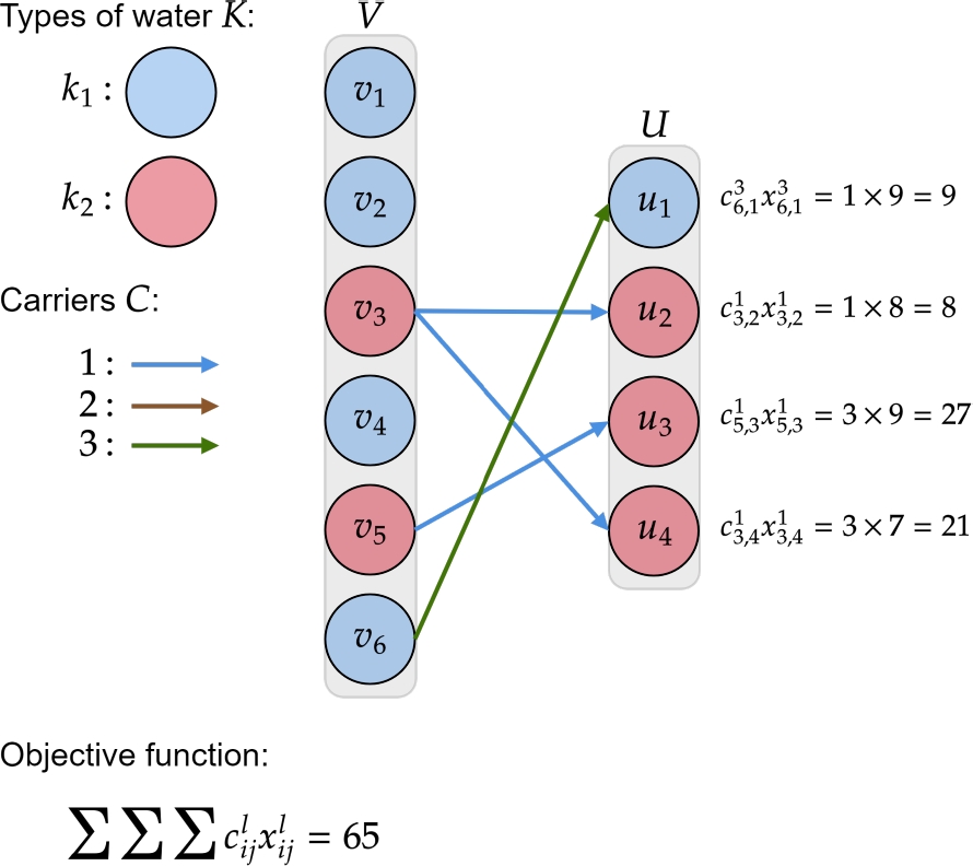 In this scenario, the method of water transportation is inconsequential; That is, we ignore the specific mode of transportation and instead introduce the term “carriers”, which fulfill the function of transporting water units from the source vertices to the demand vertices, establishing a cost associated with said transportation, which can be different between carriers.