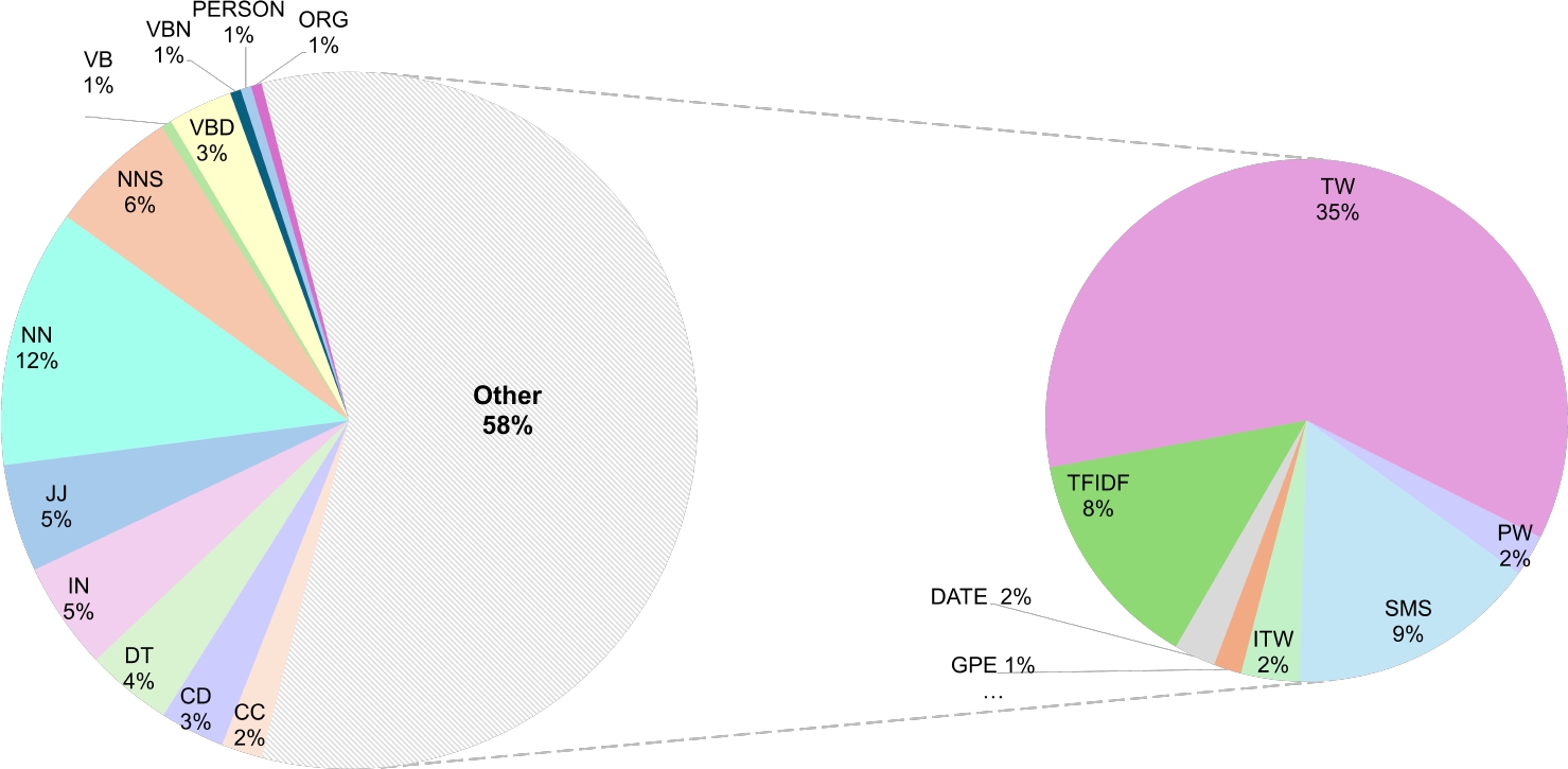The presence of POS or NER tags can indicate the importance of words in a sentence. While it is possible to capture the frequency of all available POS or NER tags (54 in total), we focused on the most common ones (14), which are listed in the following table: