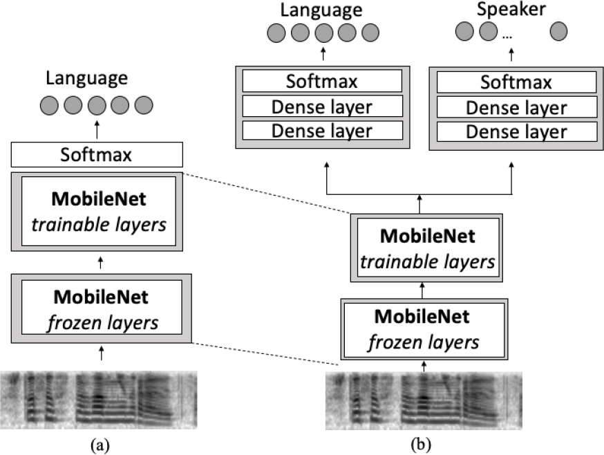 The pre-trained block is succeeded by trainable layers of the convolutional block, which are also part of the MobileNetV2. However, unlike the pre-trained block, their parameters are learned over the training set. In the multi-task setup, with MobileNet’s trainable layers, two individual task branches are trained: language as the main task and speaker identity as the auxiliary task [16].
