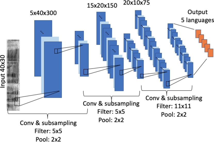Fig. 3 Representation of Lozano’s single-task model architecture, with 3 hidden layers of 5, 15 and 20 filters respectively to discriminate among 5 languages