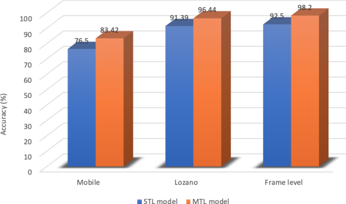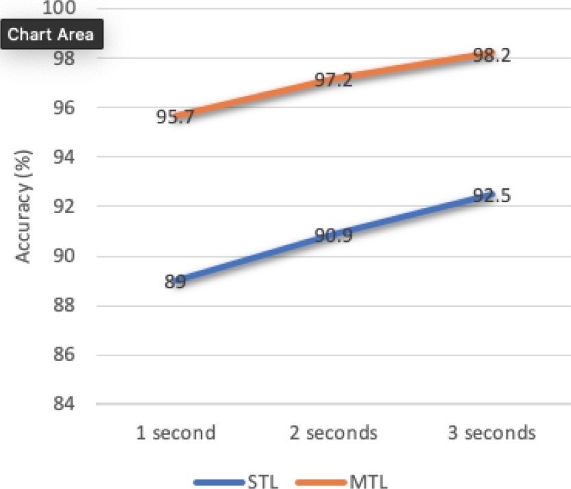 Figure 5 collects the results of the majority voting over 1, 2, and 3-second intervals for the frame-level model. It is worth noting that for equal test utterance durations (3s), the frame-level approach performs better than the approaches of Mobile and Lozano. The posterior combination also demonstrates the improvement of the MTL approach in comparison to the STL.