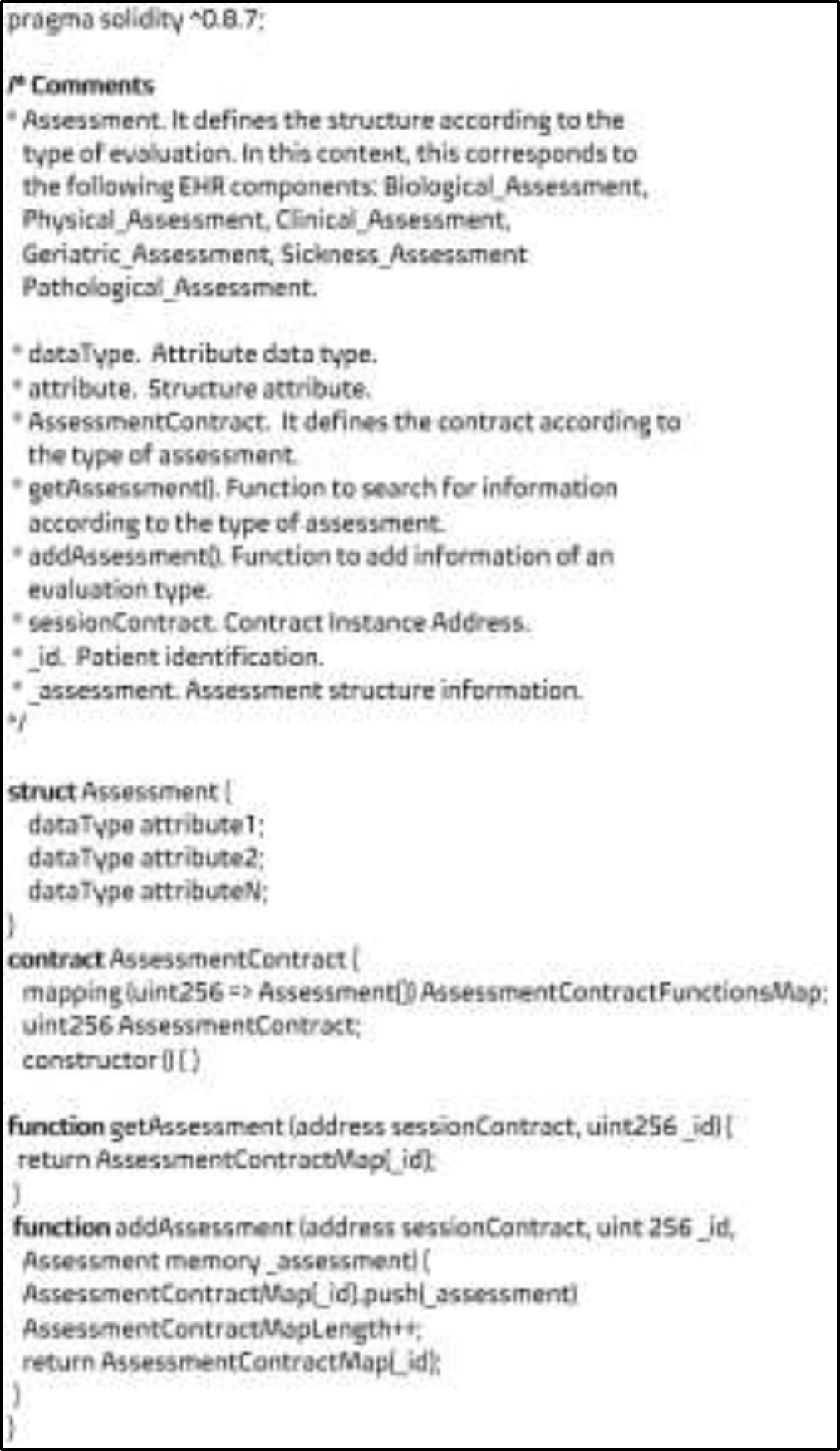 Based on this, seven smart contracts were developed and implemented on the blockchain, namely: user management, physical, biological, clinical, pathological, geriatric, and sickness assessments.