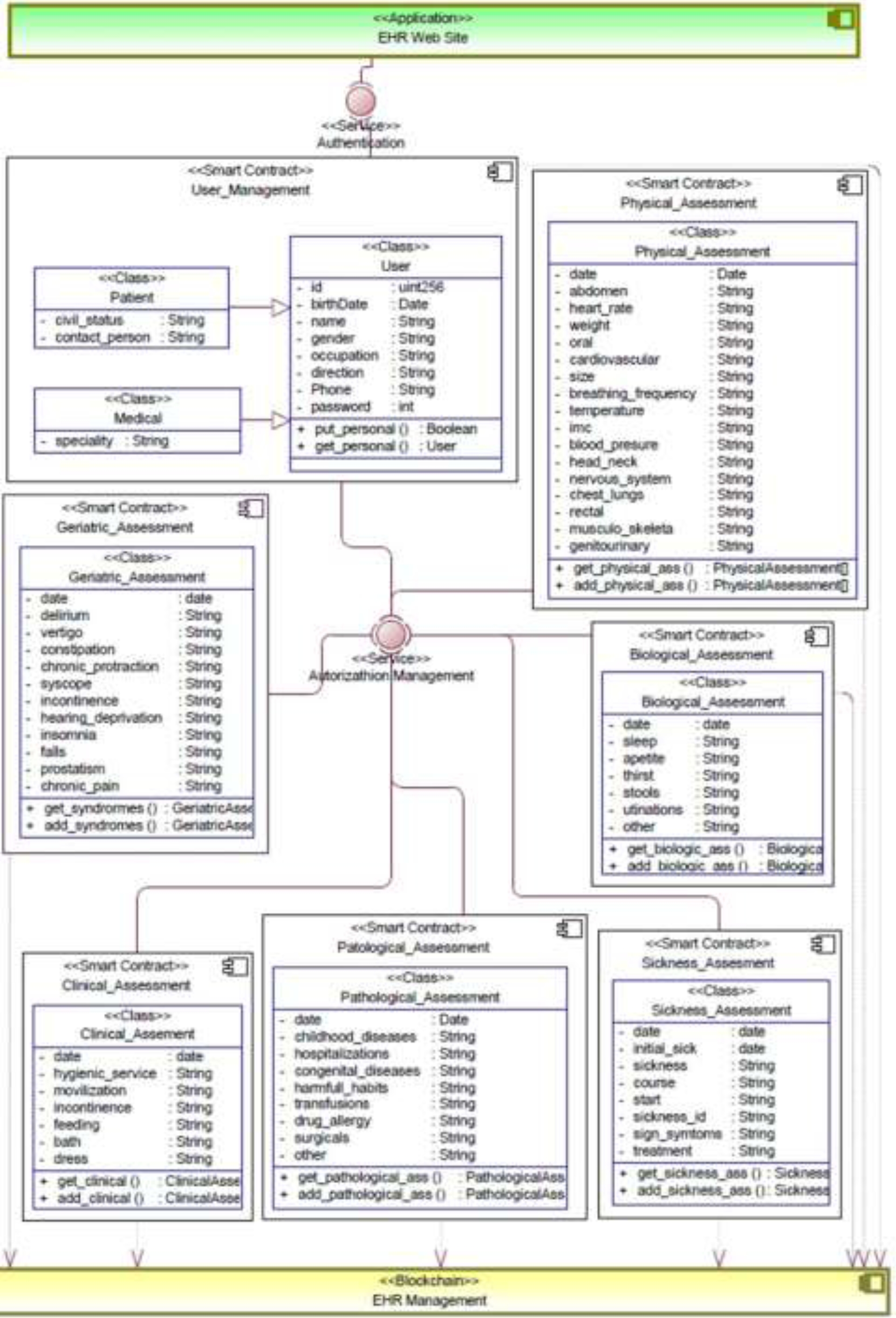 This allows the modeling of information related to the health status of an older adult. Consequently, a smart contract-based UML component diagram is designed using the defined classes.