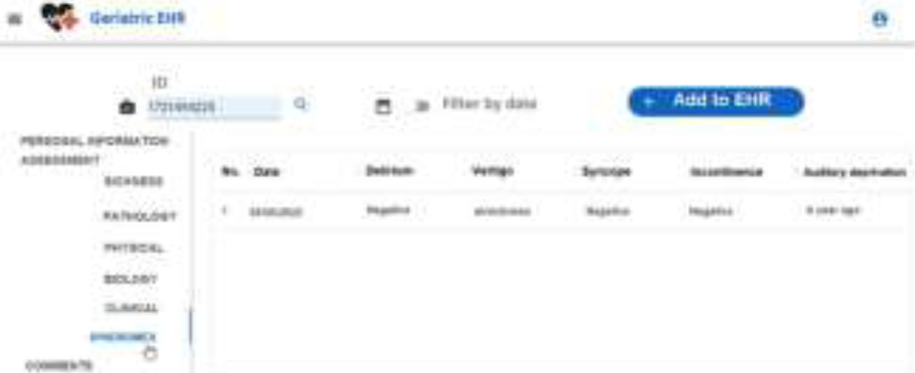 This research contributes both to theory and practice. In theory terms. A model is designed using two perspectives. First, a button-up schema to explain how the various layers of the model interact with each other. Second, a UML class model is designed to describe the attributes, operations, and relationships between system objects. Each class abstracts the functionality of the various geriatric assessments that make up an EHR.
