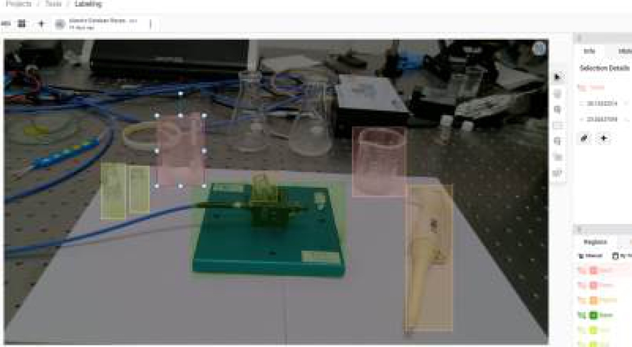 Problems such as those described above can be encountered in a materials synthesis laboratory which has highly specialized equipment and materials, so the scarcity of labeled data limits the ability to train models to help within the laboratory. This paper presents the development of a set of images containing 7 particular objects which are: beaker, flask, vial, cuvette, sample holder, precisión pipette and 3-mouth flask as seen in Figure 1.